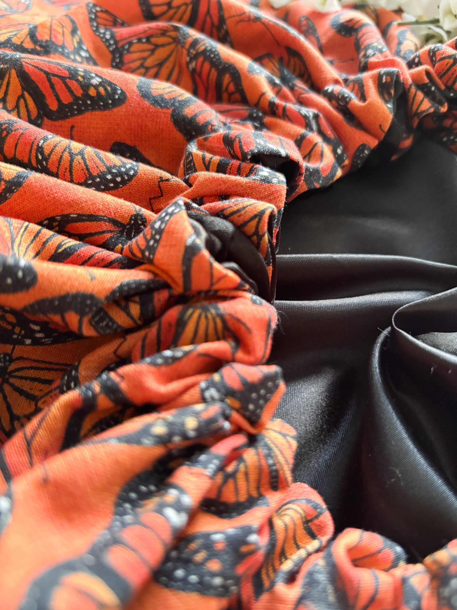 This bonnet is made from 100% cotton print fabric and silky, black satin.