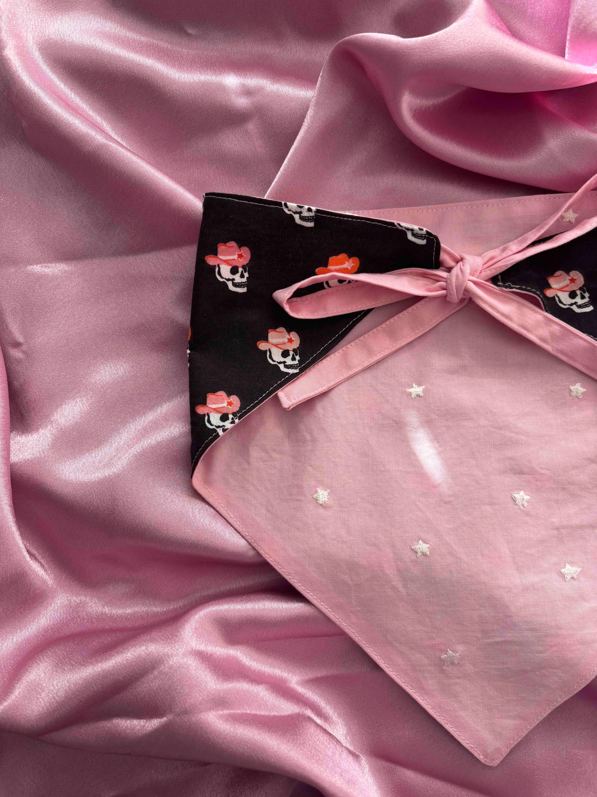 Handmade reversible triangle bandana featuring a cowboy skeleton fabric and a pink cotton with embroidered white stars.